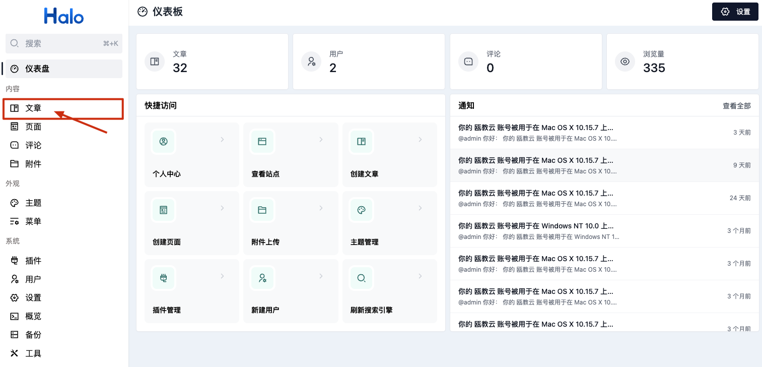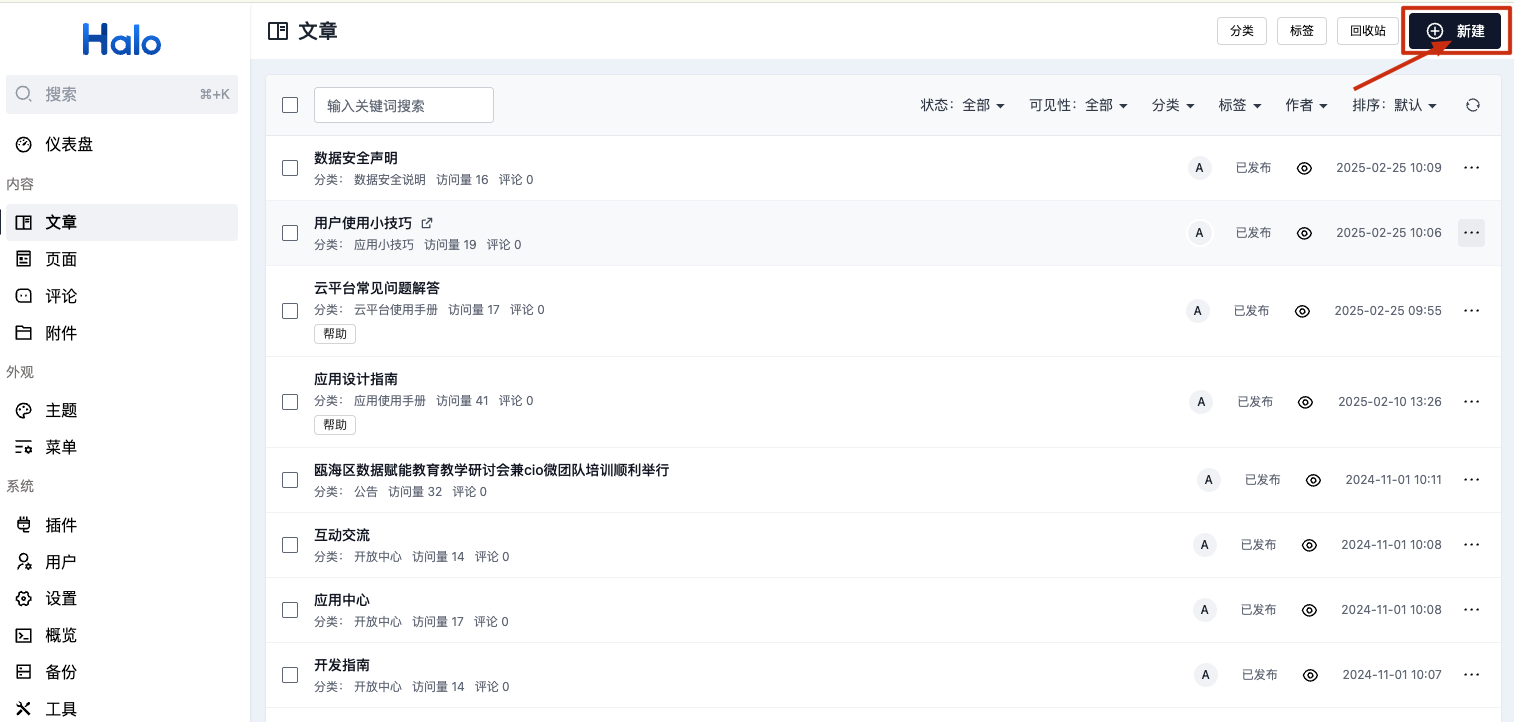点击左侧菜单栏“文章”,进入到文章列表页。